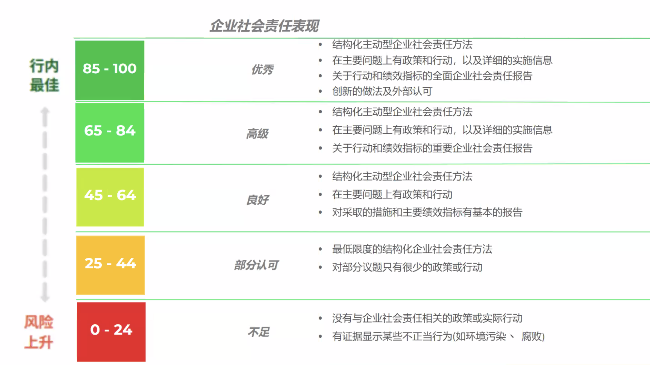 EcoVadis審核最終得分不僅能使企業(yè)了解自己的社會(huì)責(zé)任表現(xiàn)等級(jí),還能夠與同行進(jìn)行比較。該分?jǐn)?shù)等級(jí)適用于各主題得分及總分。EcoVadis分級(jí)設(shè)計(jì)是為了給中小企業(yè)的改進(jìn)留出余地,促使中小企業(yè)不斷完善。