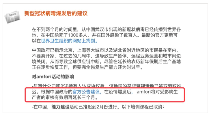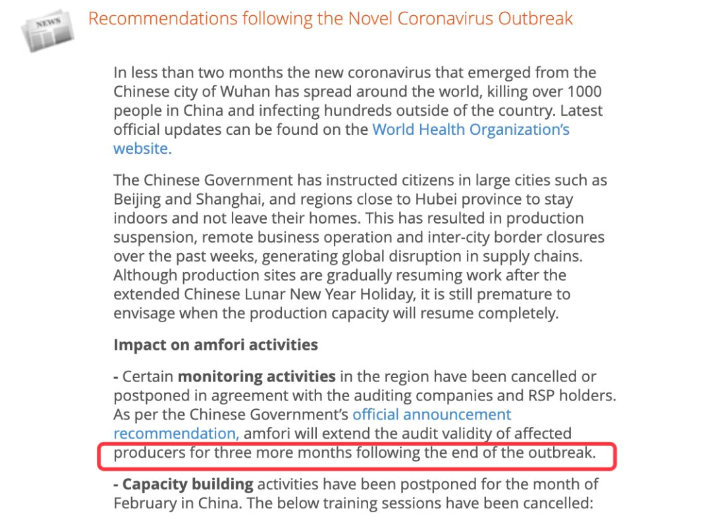 - Certain monitoring activities in the region have been cancelled or postponed in agreement with the auditing companies and RSP holders. As per the Chinese Government’s official announcement recommendation, amfori will extend the audit validity of affected producers for three more months following the end of the outbreak.